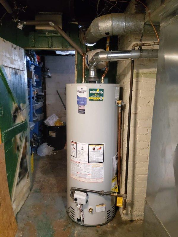 Installed Bradford White RG250T6N natural gas water heater with 50-gallon capacity and 40,000 BTU/hr heating output in basement utility area. Connected atmospheric vent system with galvanized ductwork and completed copper supply line installations with proper joints and fittings to ensure code-compliant operation.