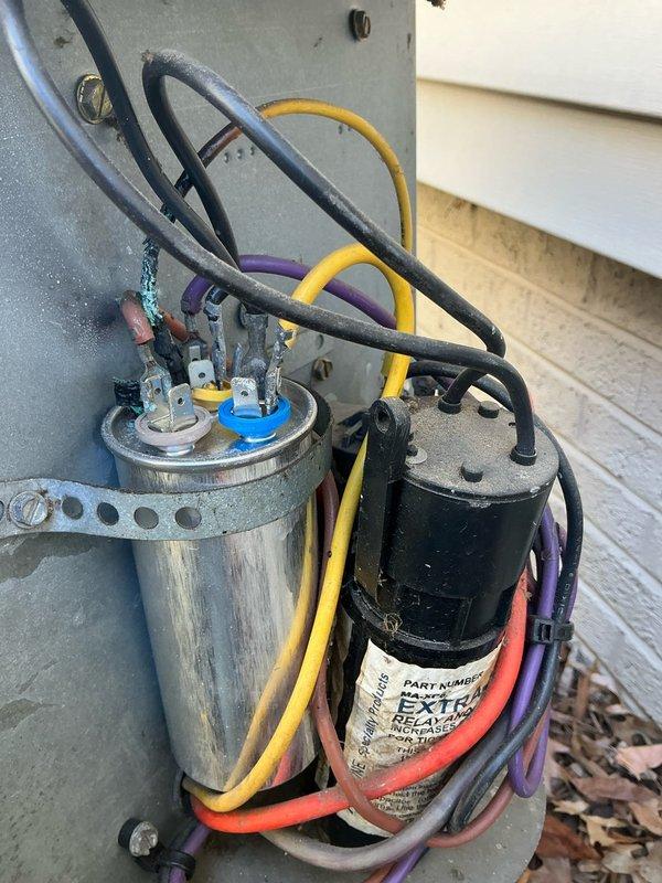 Responded to service call for aging A/C system experiencing electrical issues causing dimming lights and intermittent blower operation. Upon inspection, diagnosed faulty capacitor as primary cause of voltage drop and system instability. Replaced defective dual-run capacitor with properly rated unit, verified all electrical connections at outdoor unit, and tested system operation under load. Unit now cycles properly without voltage fluctuations, and blower motor operates consistently throughout cooling cycle.