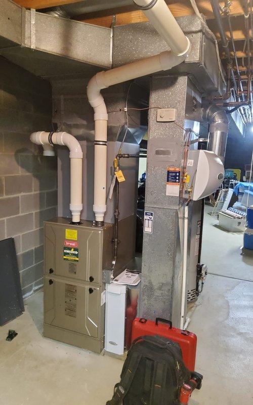 Performed scheduled heating tune-up on residential HVAC system located in basement. Inspected furnace unit, air handler, ductwork, and PVC ventilation network for proper operation and safety. All components functioning correctly with no issues identified.