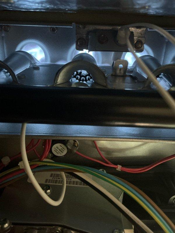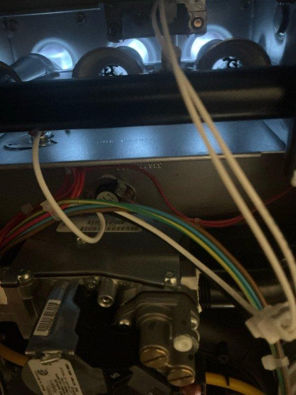 Inspected interior components of heating system, focusing on the three burners with blue flame indication. Observed and evaluated the electrical wiring connections (white, green, blue, and red) to ensure proper functionality. Examined brass valve/regulator component in lower section for operational integrity.
