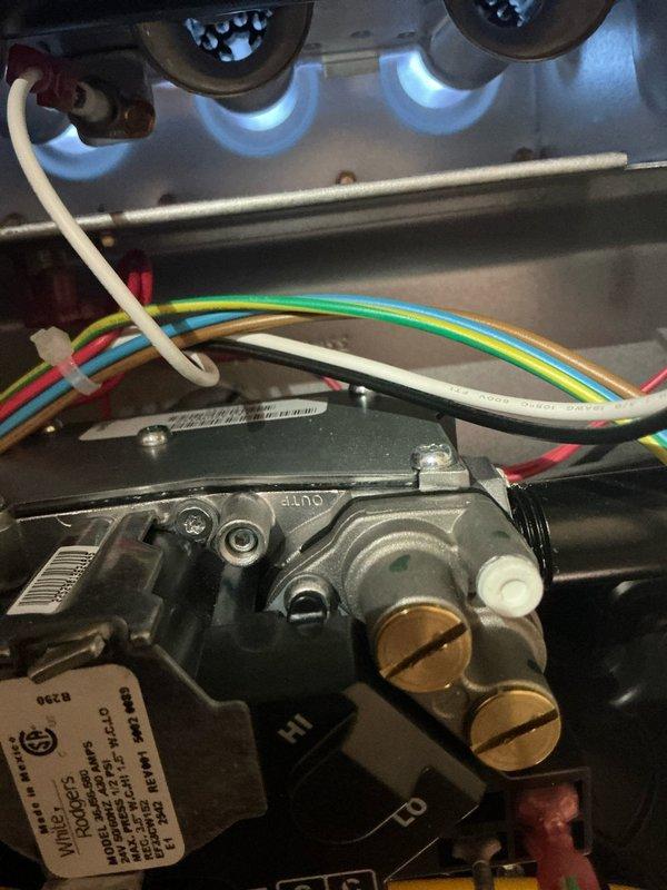 Performed diagnostic inspection of gas furnace system, confirming proper operation of the gas valve assembly and burner ignition sequence. Visual inspection revealed normal flame pattern with characteristic blue flame at burner tubes, indicating complete combustion. Verified electrical connections were secure with all control wiring (green, yellow, blue, red, and white) properly routed and terminated according to manufacturer specifications.