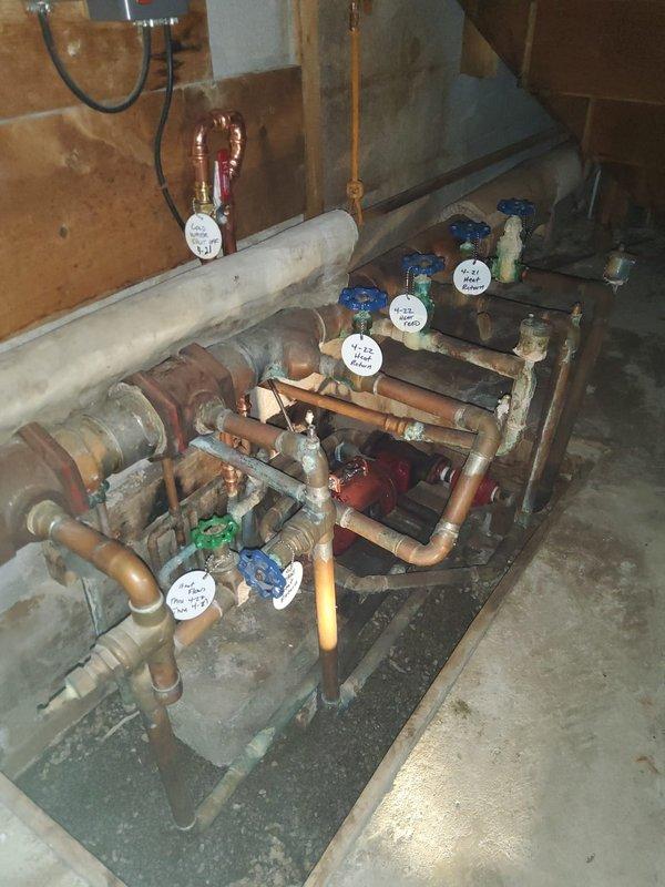 Performed diagnostic service on 20+ year old boiler system. Identified damaged coupler requiring repair and documented current state of plumbing installation with visible oxidation on copper pipes. System includes multiple tagged shut-off valves and circulation components that will need attention during scheduled repair service.