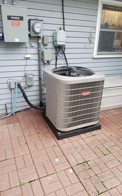 Completed full HVAC system replacement including Bryant condensing unit and new furnace with upgraded venting system. Installed dual 2" PVC flue pipes through garage wall, eliminating existing chimney PVC flue path. Additional work included reusing existing lineset after flushing, replacing return drop, installing Aprilaire filter and Ecobee thermostat, and replacing condensate pump with new tubing.