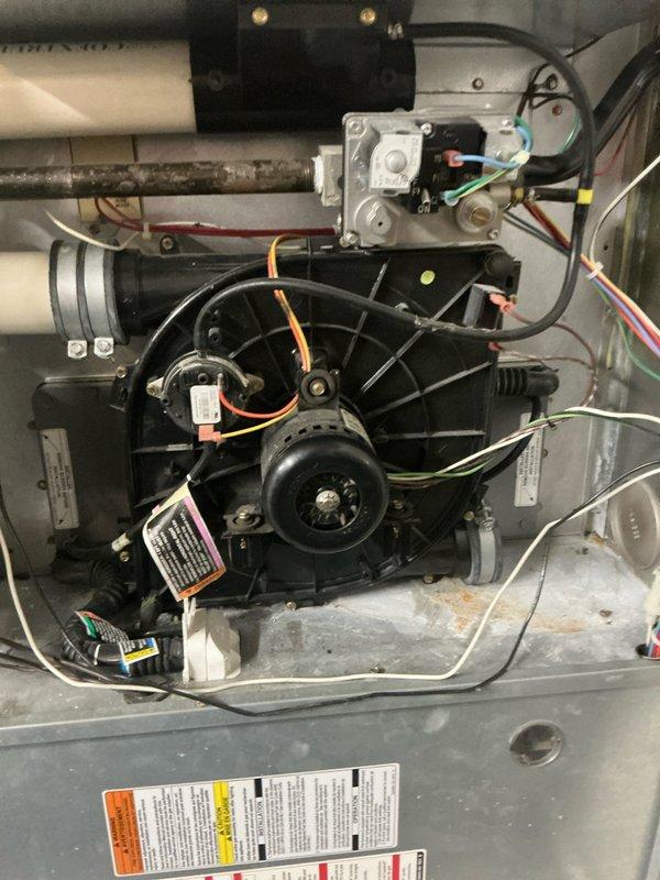 Diagnosed and repaired 19-year-old furnace with non-functioning blower motor. Replaced blower motor assembly, reconnected wiring harness (red, orange, green, white, and blue wires), and verified proper operation of gas valve and ventilation system. Unit successfully restored to working condition after thorough testing of heating cycle.