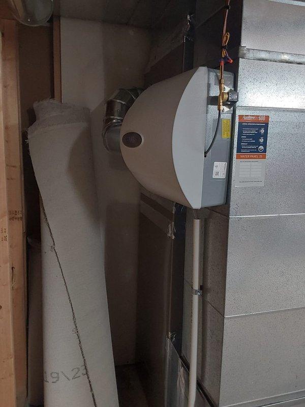 Installed new Amana furnace with high airflow base, maintaining existing 3" PVC venting, thermostats, and zoning system. Successfully mounted new 600 model humidifier on the return side and installed air cleaner while preserving the existing return drop configuration.