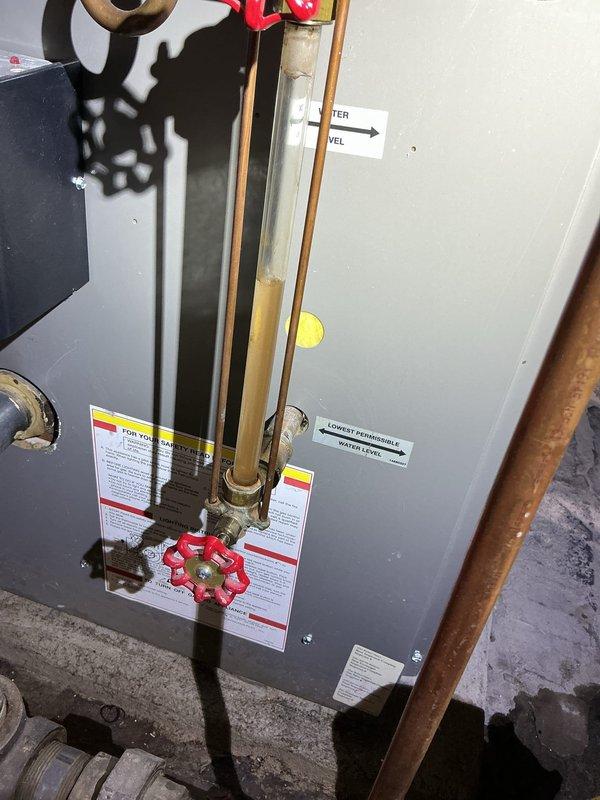 Responded to a service call for a 14-year-old natural gas steam boiler with a reported leak at the sight glass assembly. Upon arrival, confirmed the unit had been shut down by the customer as a safety precaution. Inspected the sight glass assembly, associated piping connections, and shut-off valves, documenting the condition with photographs for service records and future reference.
