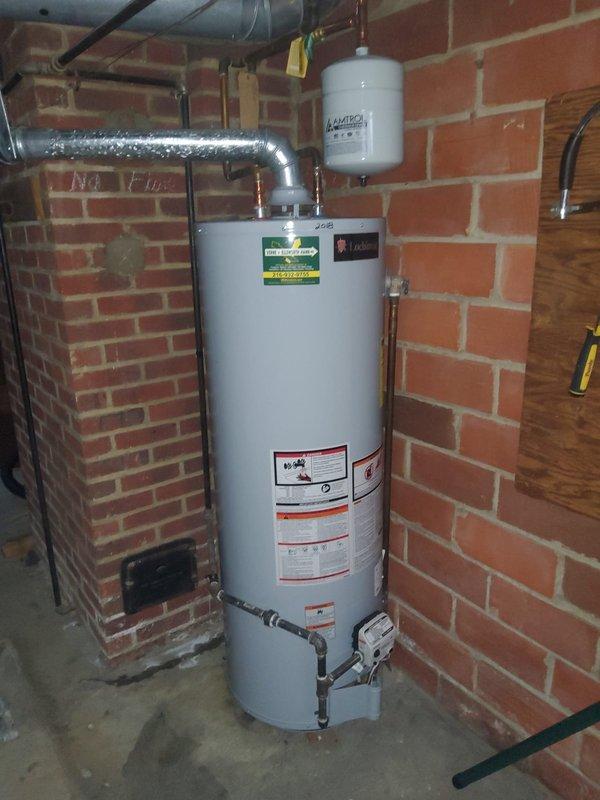 Replaced existing tall water heater with a shorter model to address insufficient flue pitch issues. Installed new gas shut-off valve during the swap. Water heater now properly positioned against brick wall with appropriate venting and expansion tank connection.