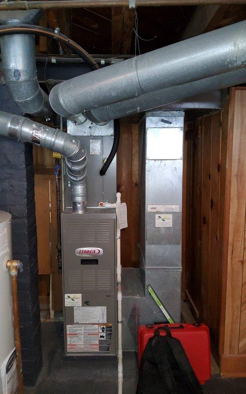 Performed routine maintenance on 30-year-old Lennox gas furnace system. Inspected ductwork and connections for proper functionality, addressing minor rattling noise reported by customer. Completed full tune-up including component inspection, cleaning, and operational verification; system now functioning properly with noise issue resolved.