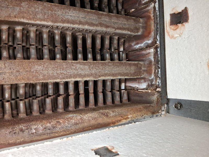 Inspected heating system and identified severe corrosion and rust damage on the heat exchanger fins. The metal components show extensive deterioration with rust stains spreading to surrounding surfaces. Recommend immediate replacement of the heat exchanger due to safety concerns and potential efficiency loss.