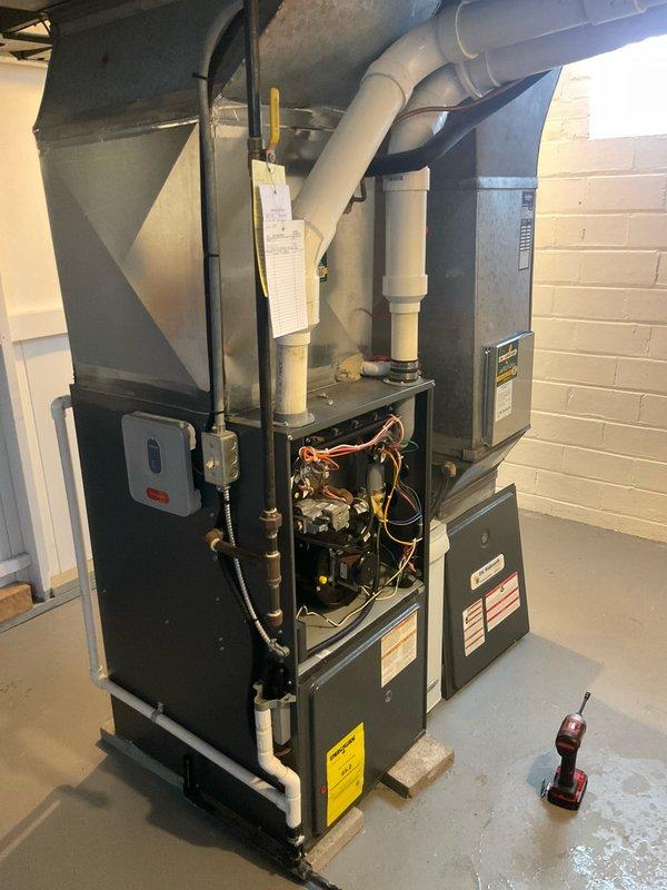 Performed annual heating tune-up on residential furnace system. Inspected all internal components including control board, wiring connections, and mechanical parts. Verified proper operation of PVC exhaust/intake vents and confirmed unit is correctly mounted on concrete foundation with no visible issues or malfunctions.