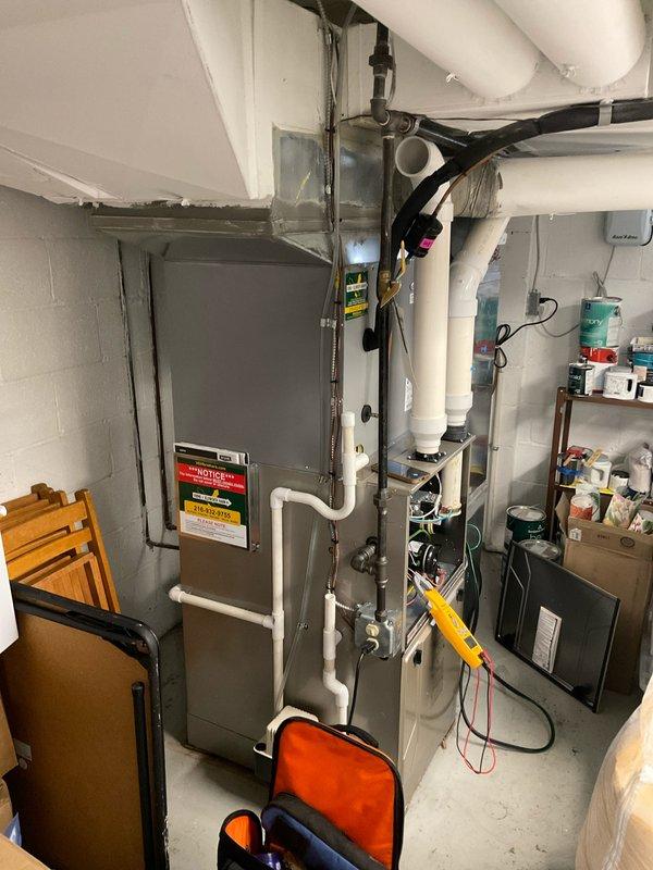 Performed standard furnace tune-up service in basement utility room. Conducted comprehensive diagnostic testing with electrical meter on residential HVAC system. Inspected PVC venting, ductwork connections, and overall system functionality to ensure proper operation for heating season.