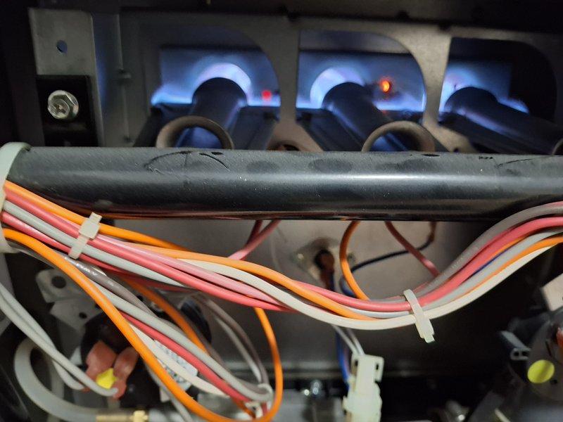 Performed scheduled furnace tune-up. Inspected internal components including electrical wiring harness and gas burner tubes. Verified proper ignition with clean blue flame indicating normal combustion operation.